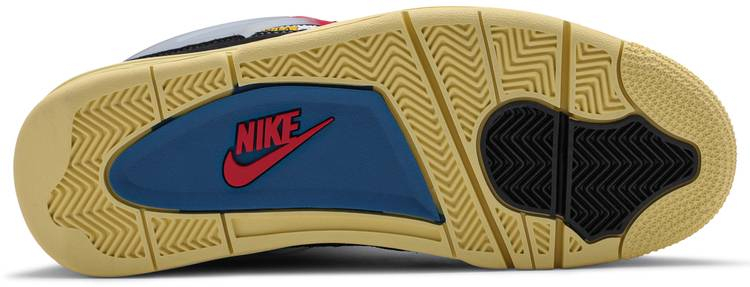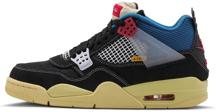 The Union LA x Air 4 Retro ‘Off Noir’ represents the follow-up effort to the duo’s highly coveted Air 1 collaboration from 2018. The updated design features a black suede upper with matching black mesh on the toe box and blue mesh around the collar. The semi-translucent structural wings are attached to molded red eyelets . matching the woven Air tag atop the padded tongue and Air branding on the heel. The TPU wings are filled in . reminiscent of an original Tinker Hatfield sketch of the AJ4 . while the AIR tag usually found on the inside of the tongue conveys a unique look . like someone folded the tongue over to expose the inside tag.